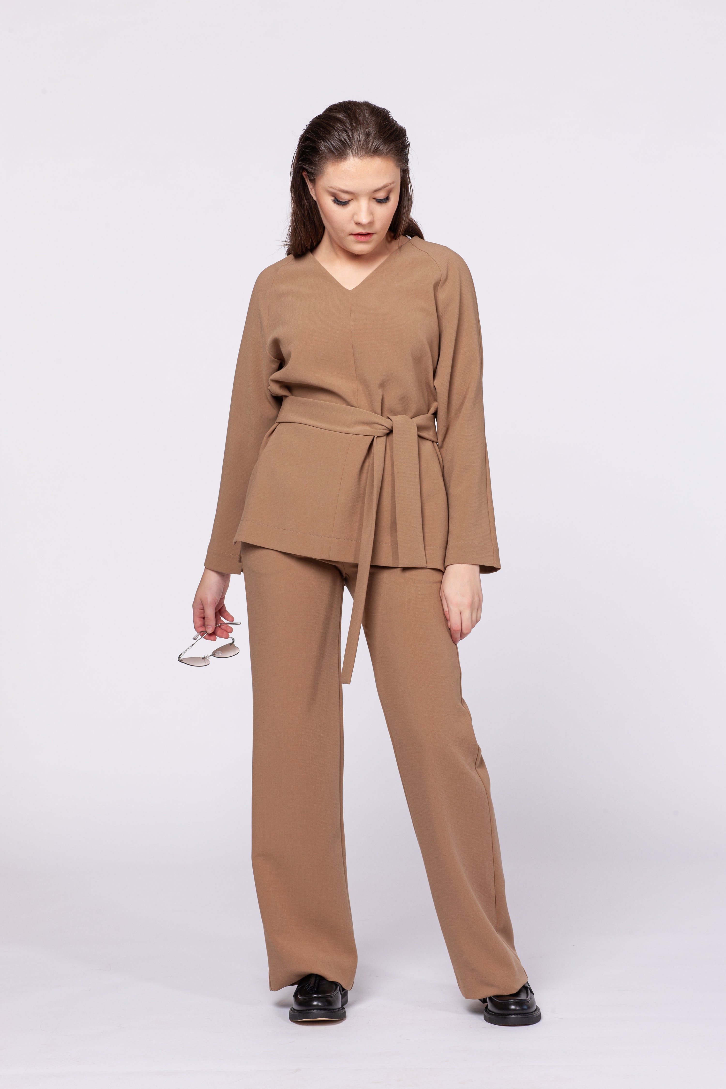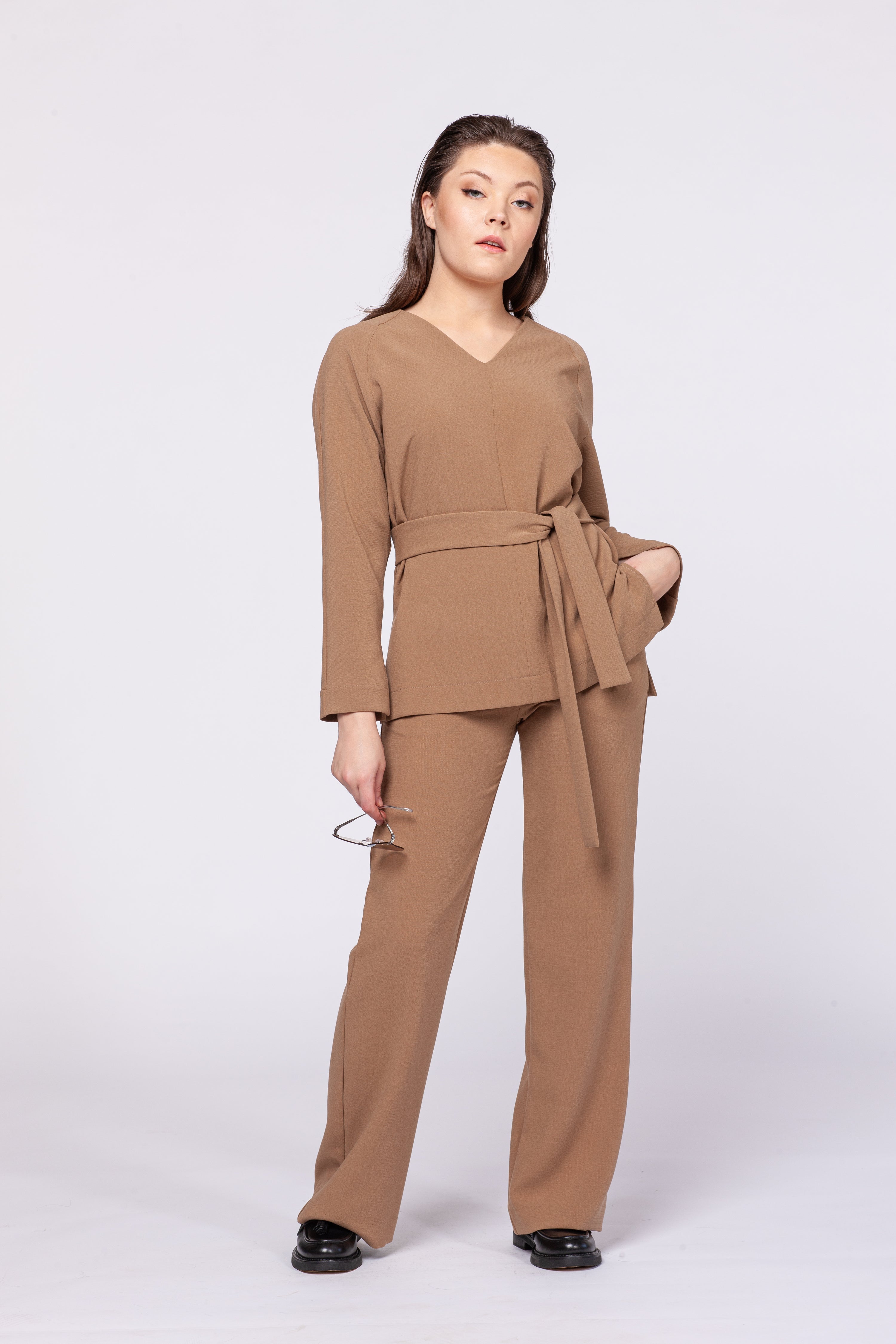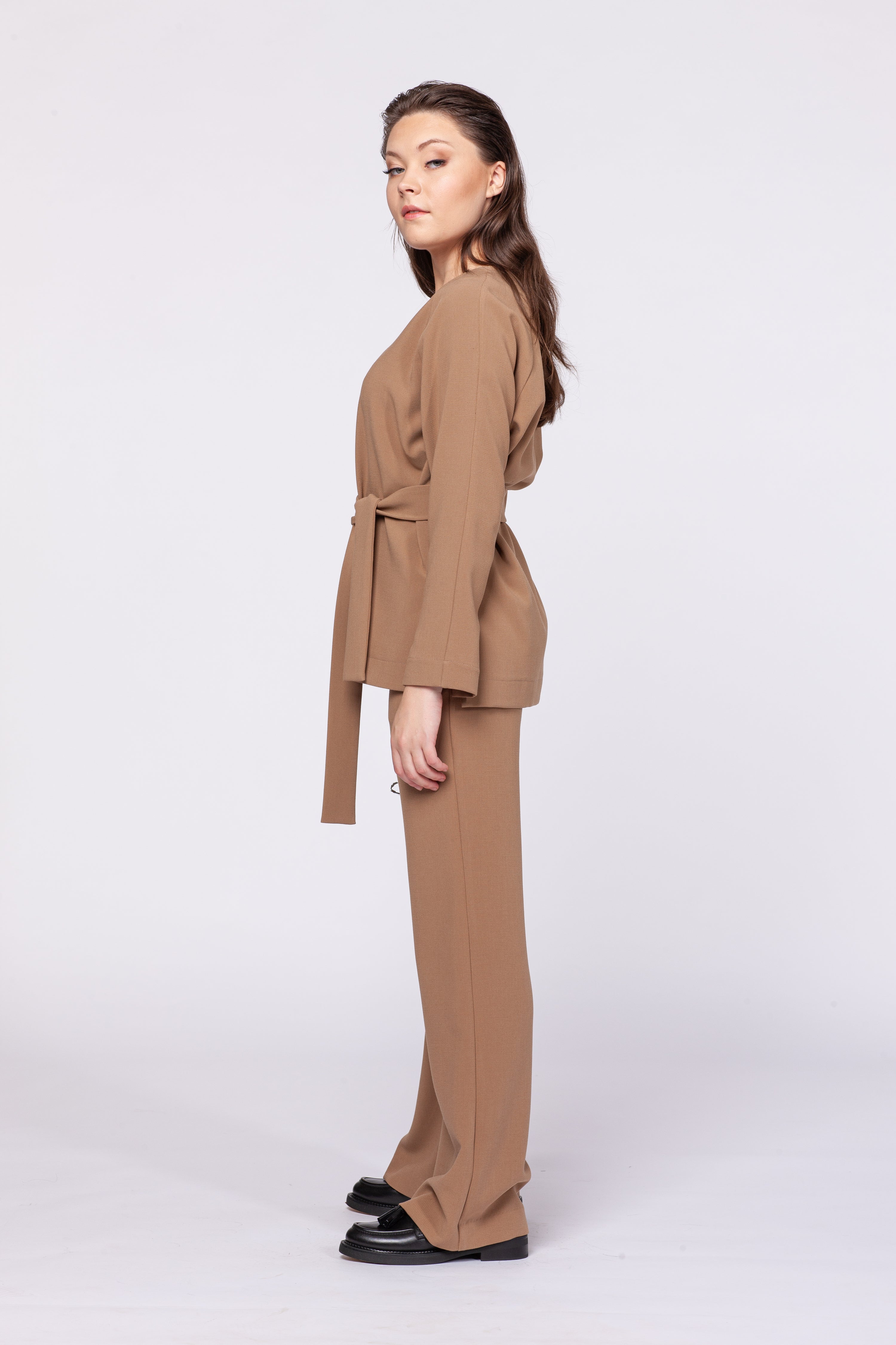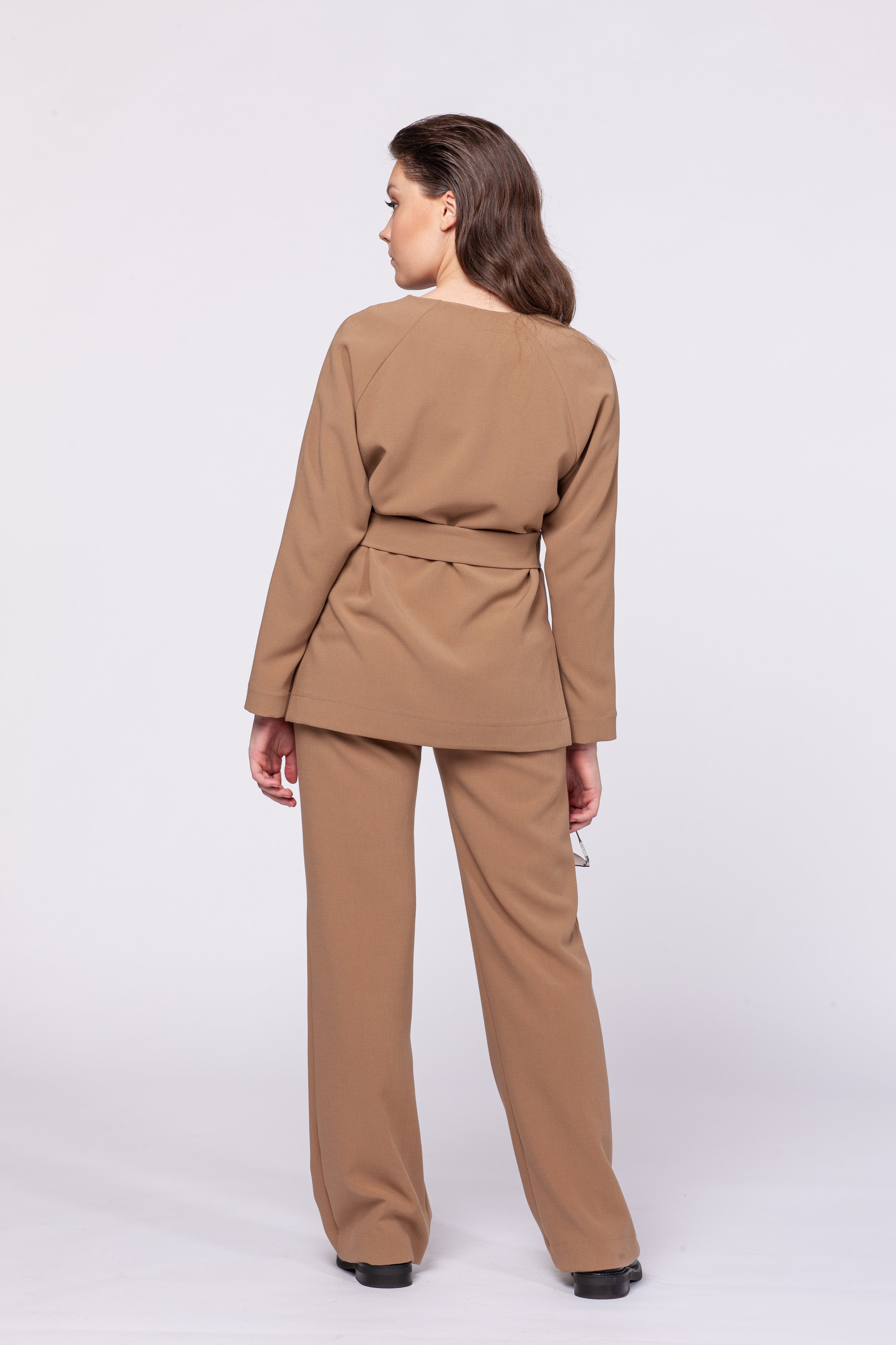 Atraskite stilių, kuris nepaliks abejingų – camel spalvos palaidinė/ švarkelis su subtilia iškirpte ir su dirželiu. Šis minimalistinis, bet išskirtinis dizainas puikiai tinka tiek darbui, tiek vakarui.